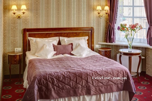 Deluxe - 3080 UAH Modern room (27 m²) with large double bed, desk, cable TV, free Wi-Fi Internet, air condition, minibar, safe, telephone. The bathroom is equipped with a shower cabin or classic bath, hair dryer, bathrobes, slippers, bathroom accessories.