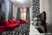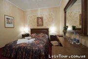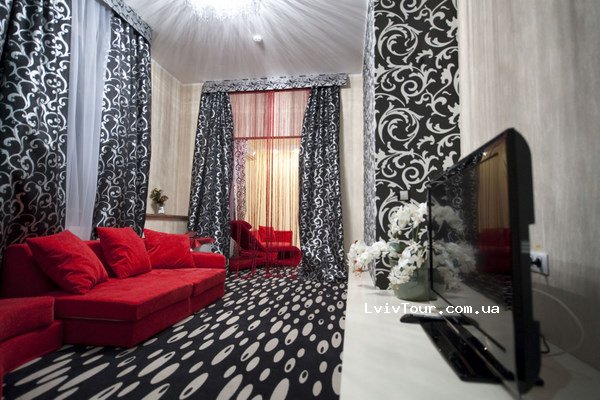 Suite - 1900 UAH This two room luxurious Suite features large double bed, soft sitting area, 2 televisions with satellite TV, telephone, mini-bar, Wi-Fi Internet, individual safe, air conditioning. Upscale designed bathroom consists of bath-jacuzzi, bidet, mini-bathroom set, bathrobes and slippers, hair dryer. There are two suites to choose: "Big Italy" and "Minimalism".