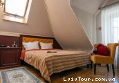 Junior - 1800 UAH Light room (22,2 m²) with a refined interior. At guests disposal one double bed, sofa, desk, satellite TV, Wi-Fi Internet, telephone, mini-bar, bathroom with a shower cabin, bath accessories, bathrobes and slippers.